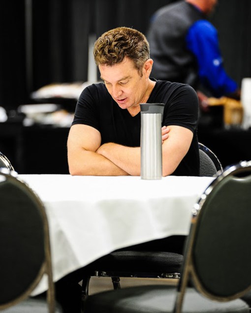 | James Marsters reads over the bio of the soldier he will introduce. |