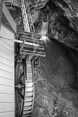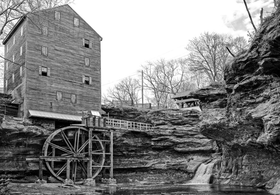 | River Level view of the Rock Mill, river falls, and covered bridge. |