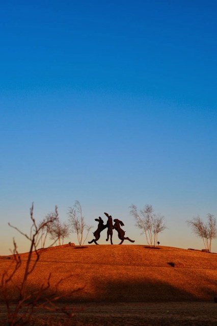 You can see the dancing hare installation from the road as you drive up to it. You don’t really get an accurate sense of the size of the sculptures until you start approaching it on foot. From a distance, the rough texture of the sculptures just appear to be a way to show a matted fur. However, as you get closer, you can see that the sculptures actually contain identifiable objects incorporated into the structure of the hares.