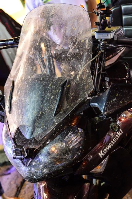 | 10,000 miles and no bath (the bike) results in this interesting modern art windshield |