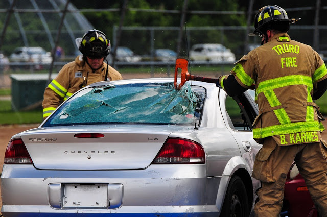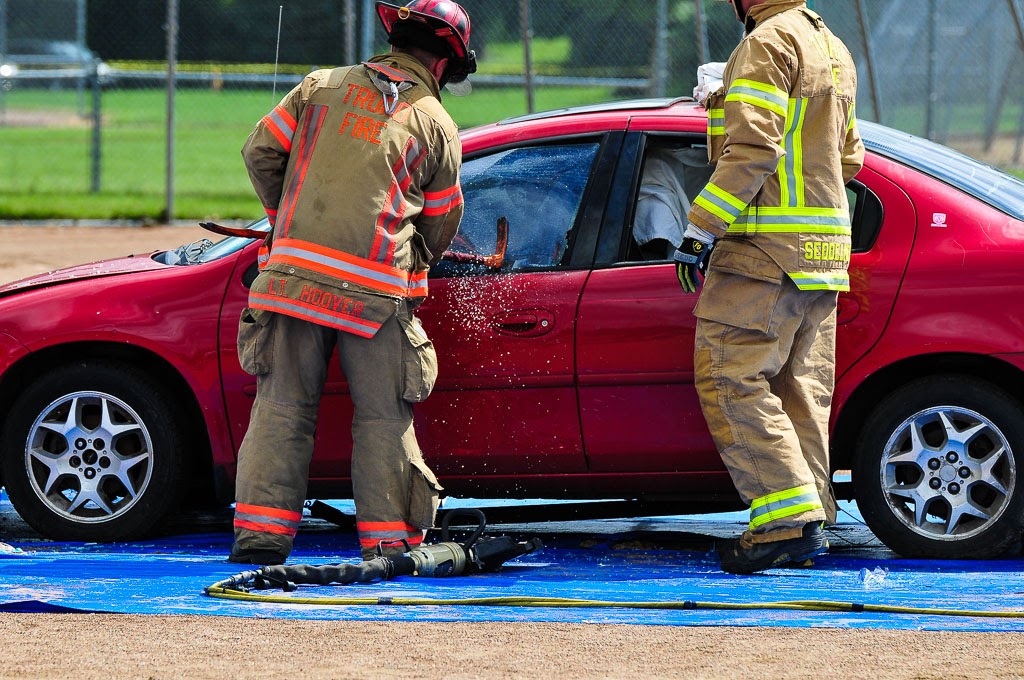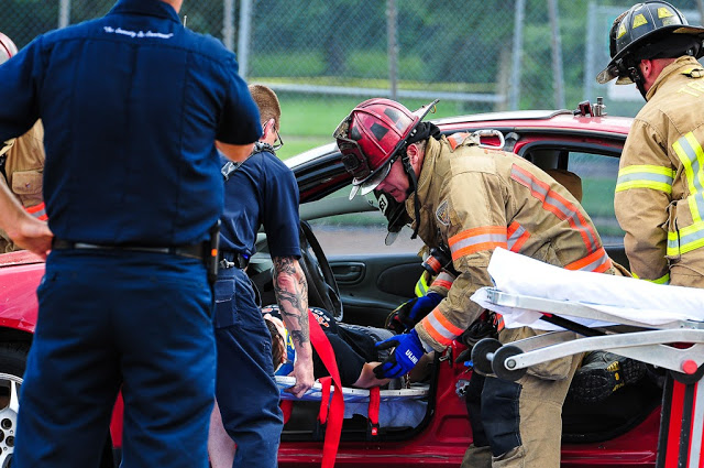 A staged accident is used to show the procedure that the firefighters go through to extract and transport.