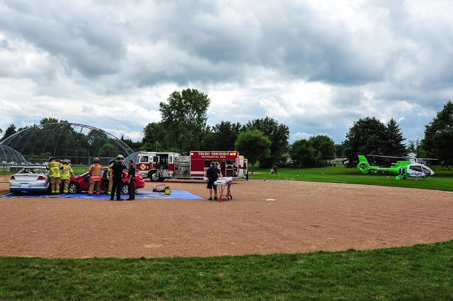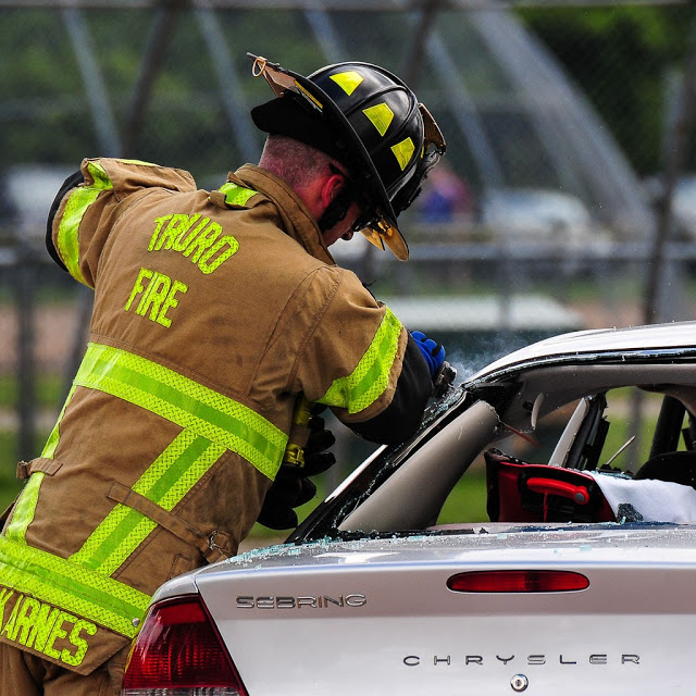 The Truro Township fire department serves the local community.  As part of community outreach, they demonstrate some of their work.  This demonstration is using heavy extraction tools to remove people from a vehicle involved in a car accident.  This demonstration occurred at the Reynoldsburg Tomato Festival.