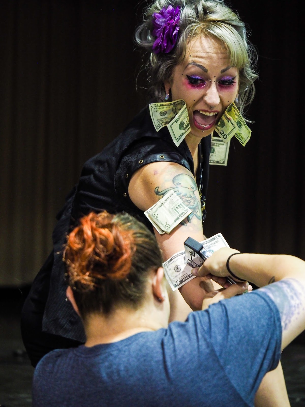 At the end of their show, they invited those that enjoyed to drop a few bills into a top hat in front of the stage. However, for those that wanted to give a little extra, they allowed $5 and up tips to be stapled directly onto their bodies with a staple gun.
