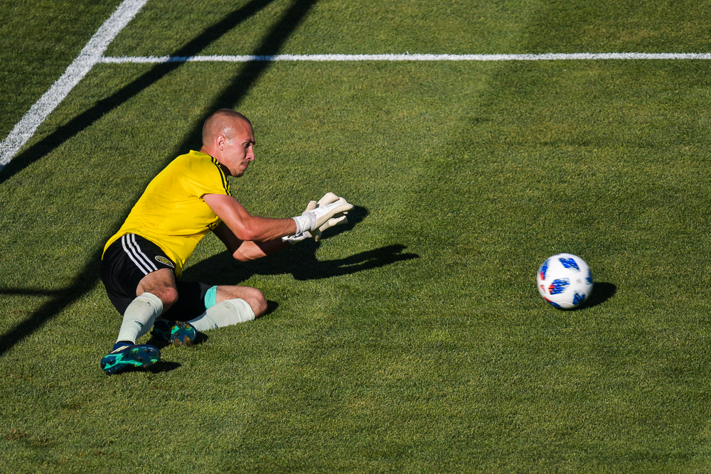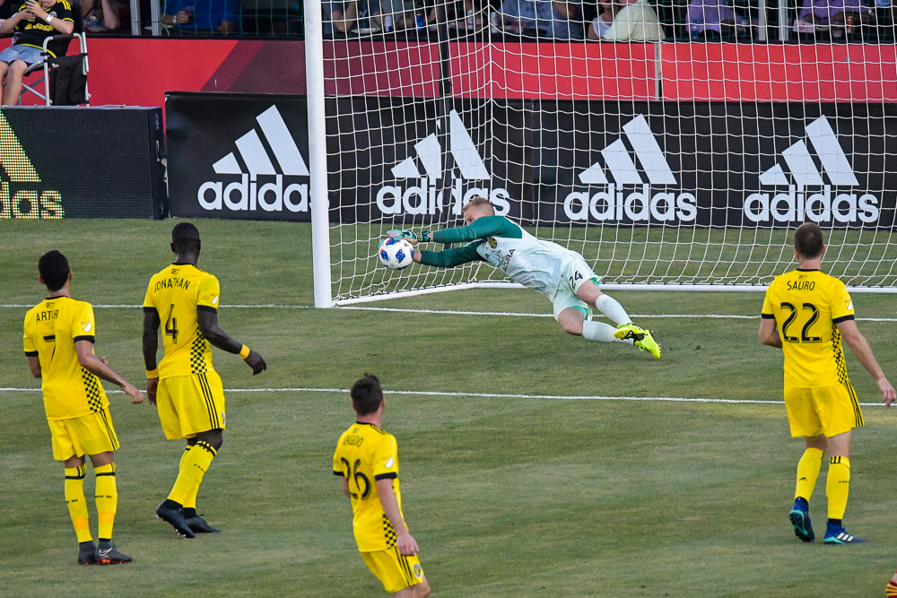 | Crew SC Keeper Kempin stops a rocket from RSL |