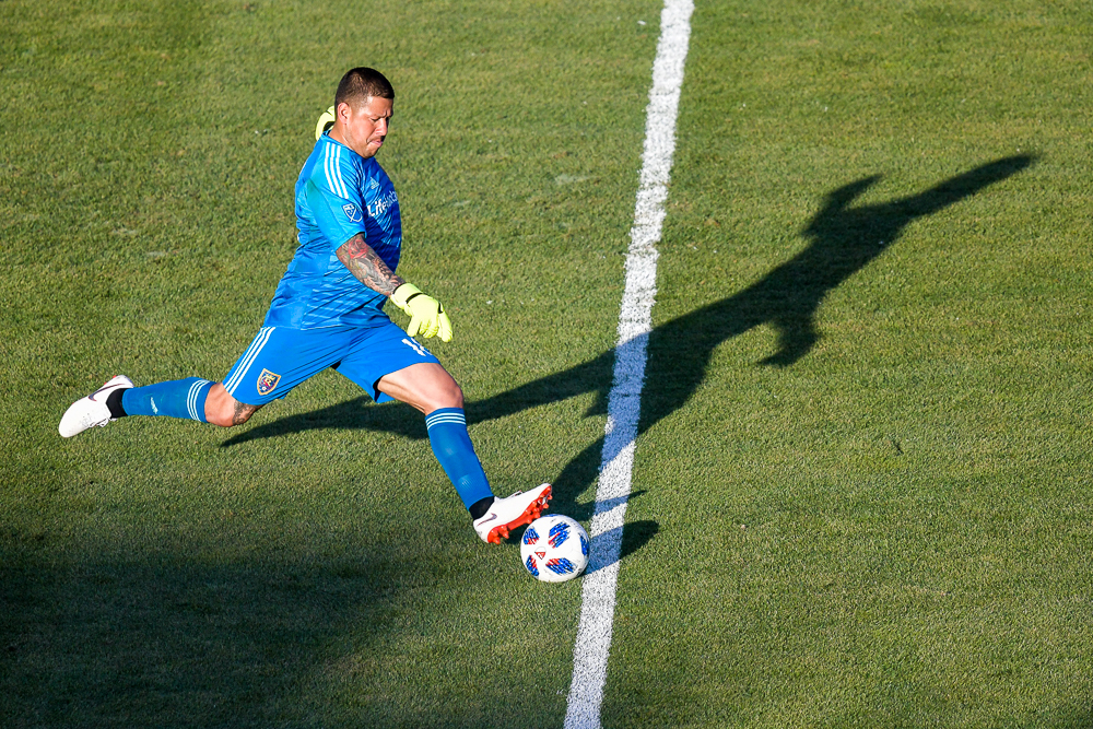 | RSL keepers Rimando puts a goal kick deep into Crew SC territory |