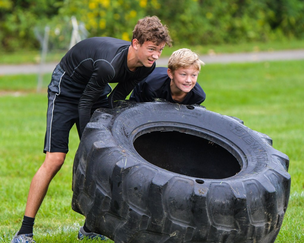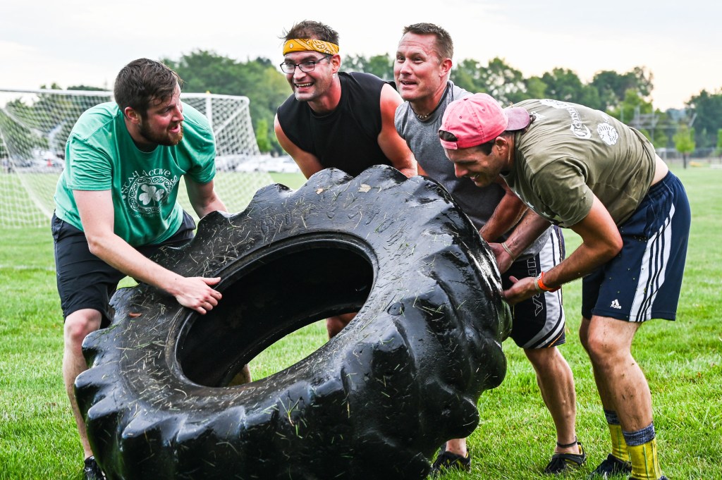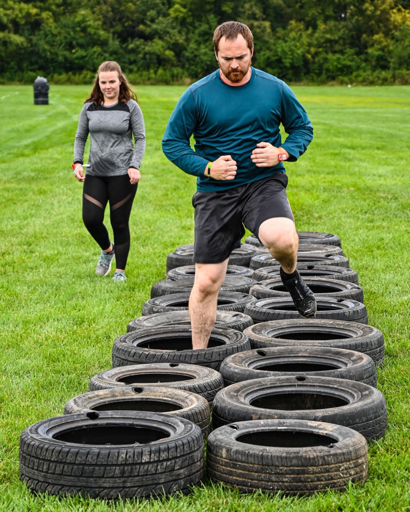 About half way through the course, the individuals and teams need to conquer the tire flip. Roughly 40 yards out and 4 yards back, the tire must be flipped end over end.
