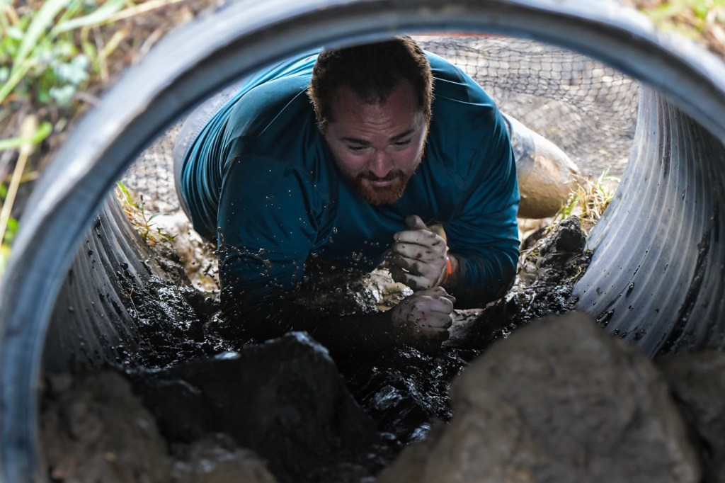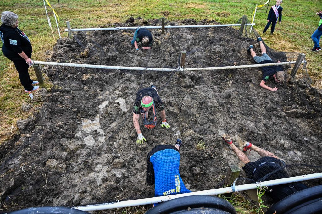 First, runners must army crawl through the mud, under the netting and into one of 4 tubes.