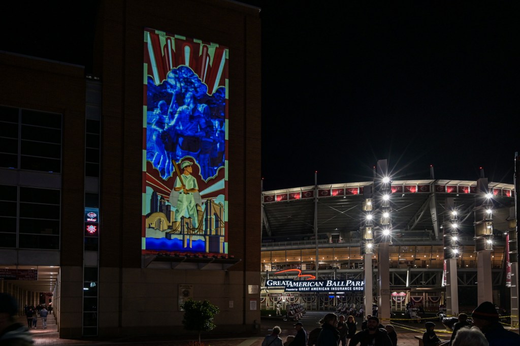 Down in The Banks Zone, Great American Ballpark had a baseball themed show displayed. Andrew really liked this one as it was not just a video being played, but the different sections of the lighting changed.