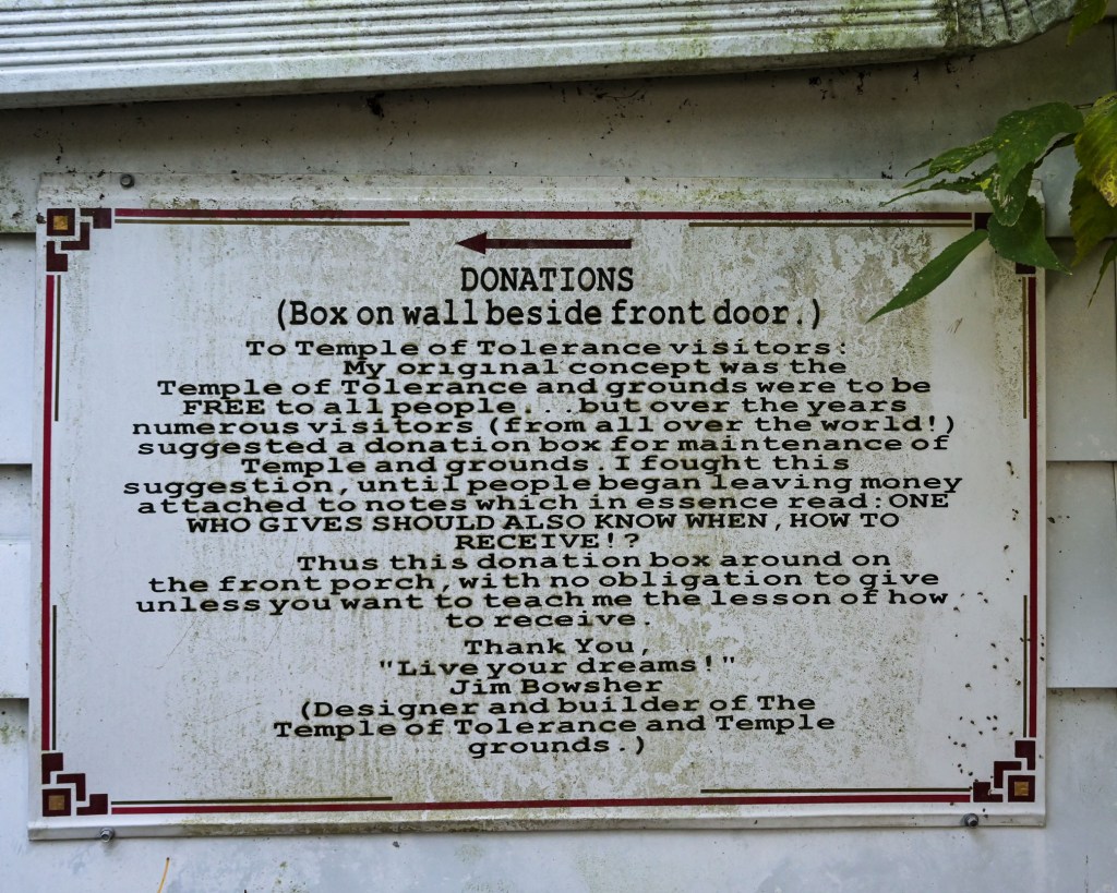 It is interesting to see also, the sign below. The Temple of Tolerance has no admission fee. Jim Bowsher did not want any money for what he did, but they needed to make concession for those that wanted to donate.