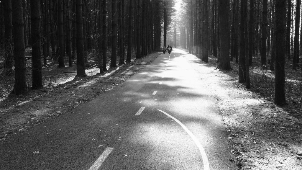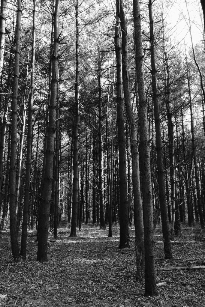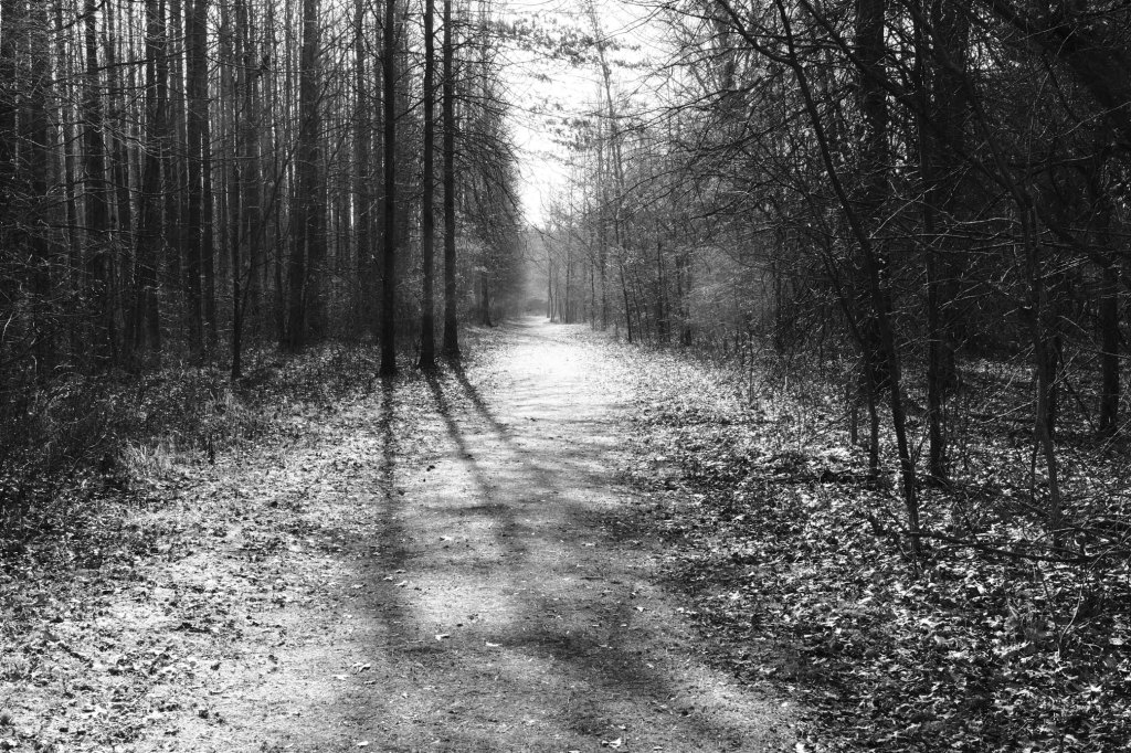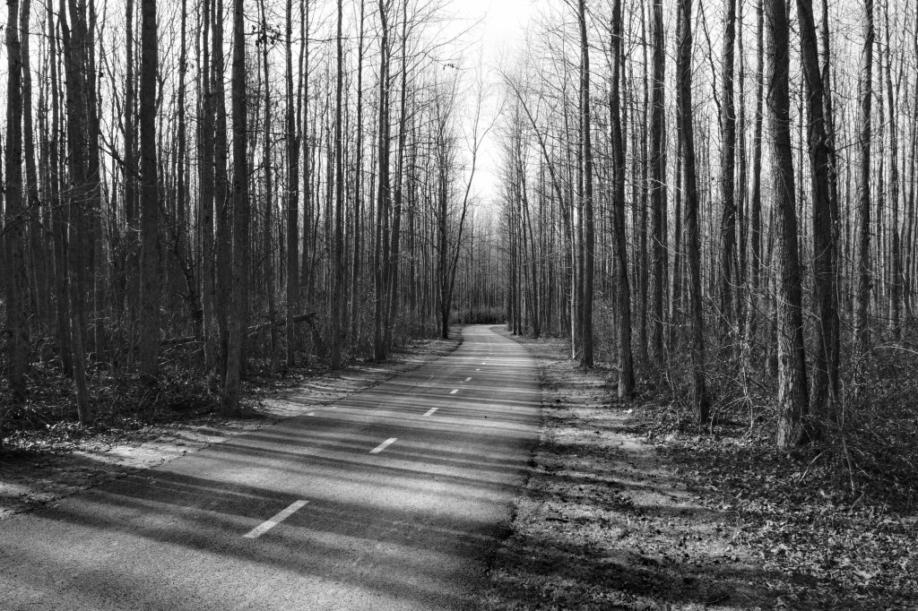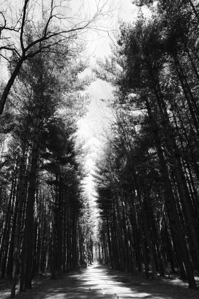 Once you get into the trail a bit, you’ll understand where this section gets its name. Very long and very straight trees line the trail path. In sections, the trees are very dense. This trail is beautiful any time of year and in any lighting conditions – be it bright sunlight or overcast.