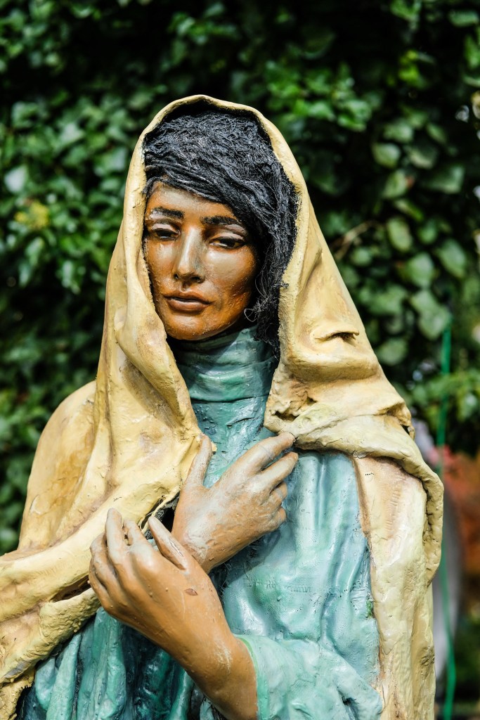 Each section shows a different part of the nativity story, with placards containing explanations.