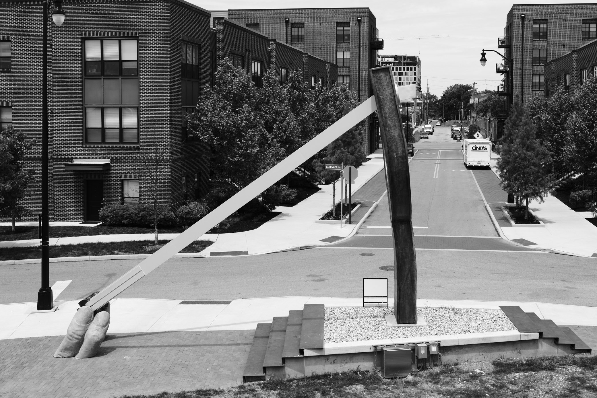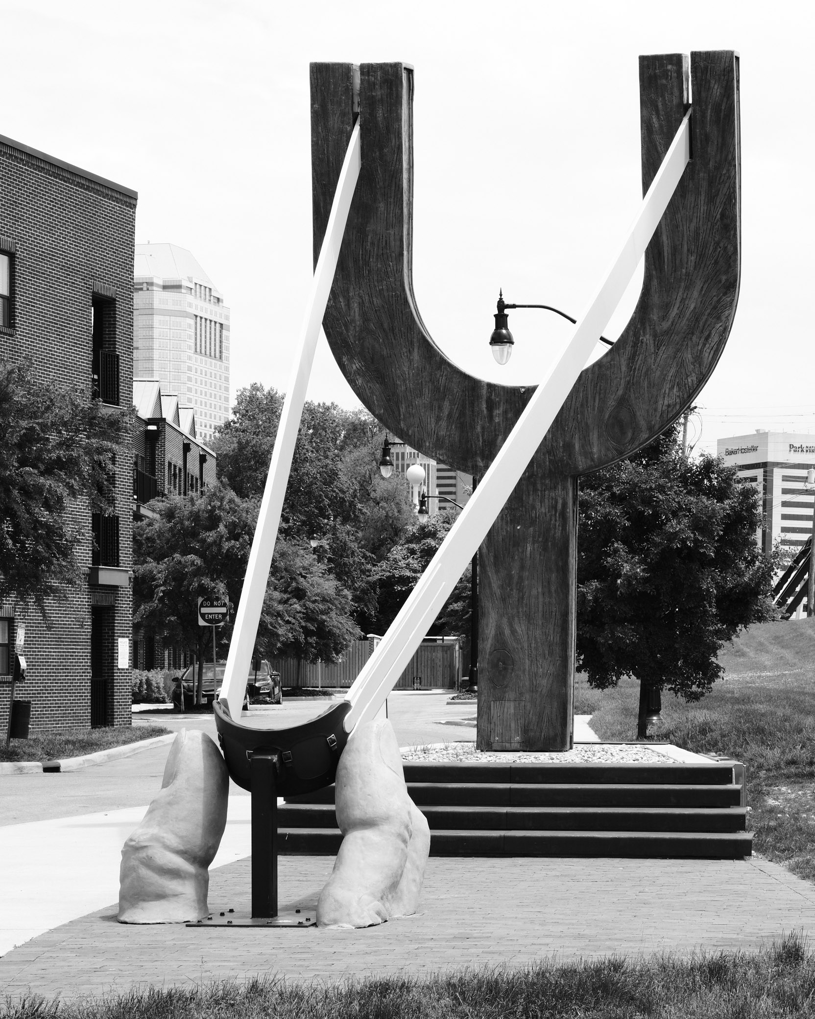 Designed by Franklinton resident and artist Andrew Lundberg of Lundberg Industrial Arts LLC, a giant slingshot sculpture is now installed at the Lucas Street Plaza. CASTO Communities wanted to place something there and approached Lundberg, whom they have worked on past projects.