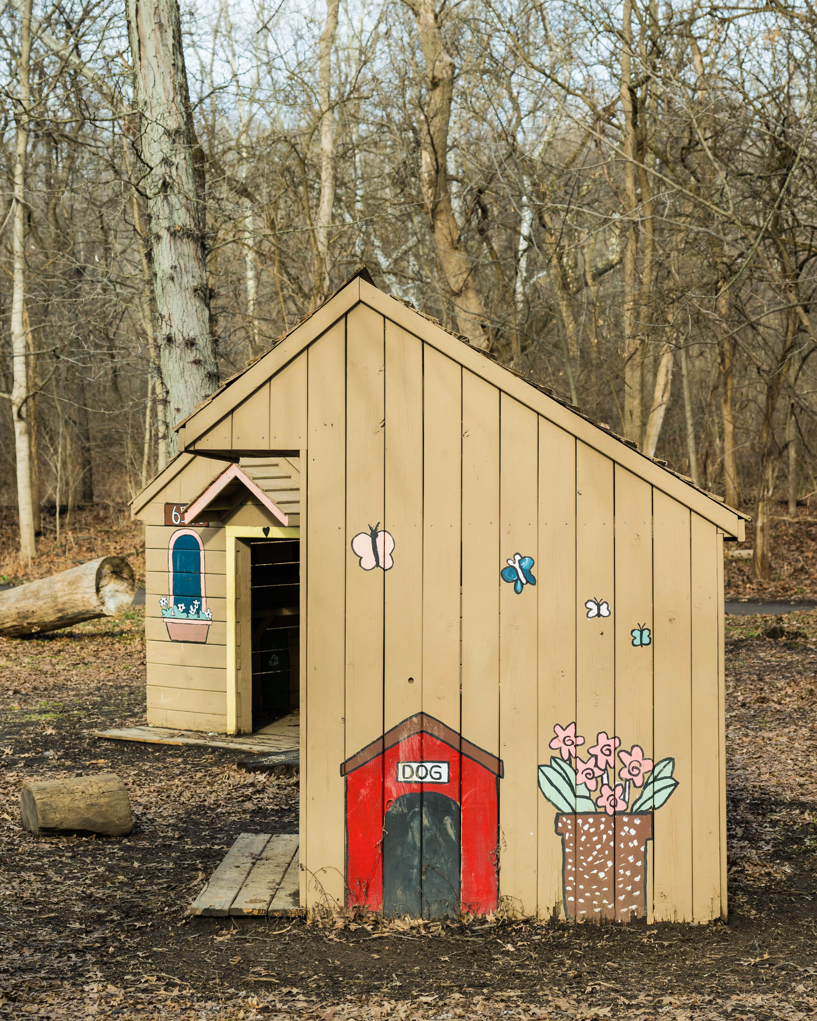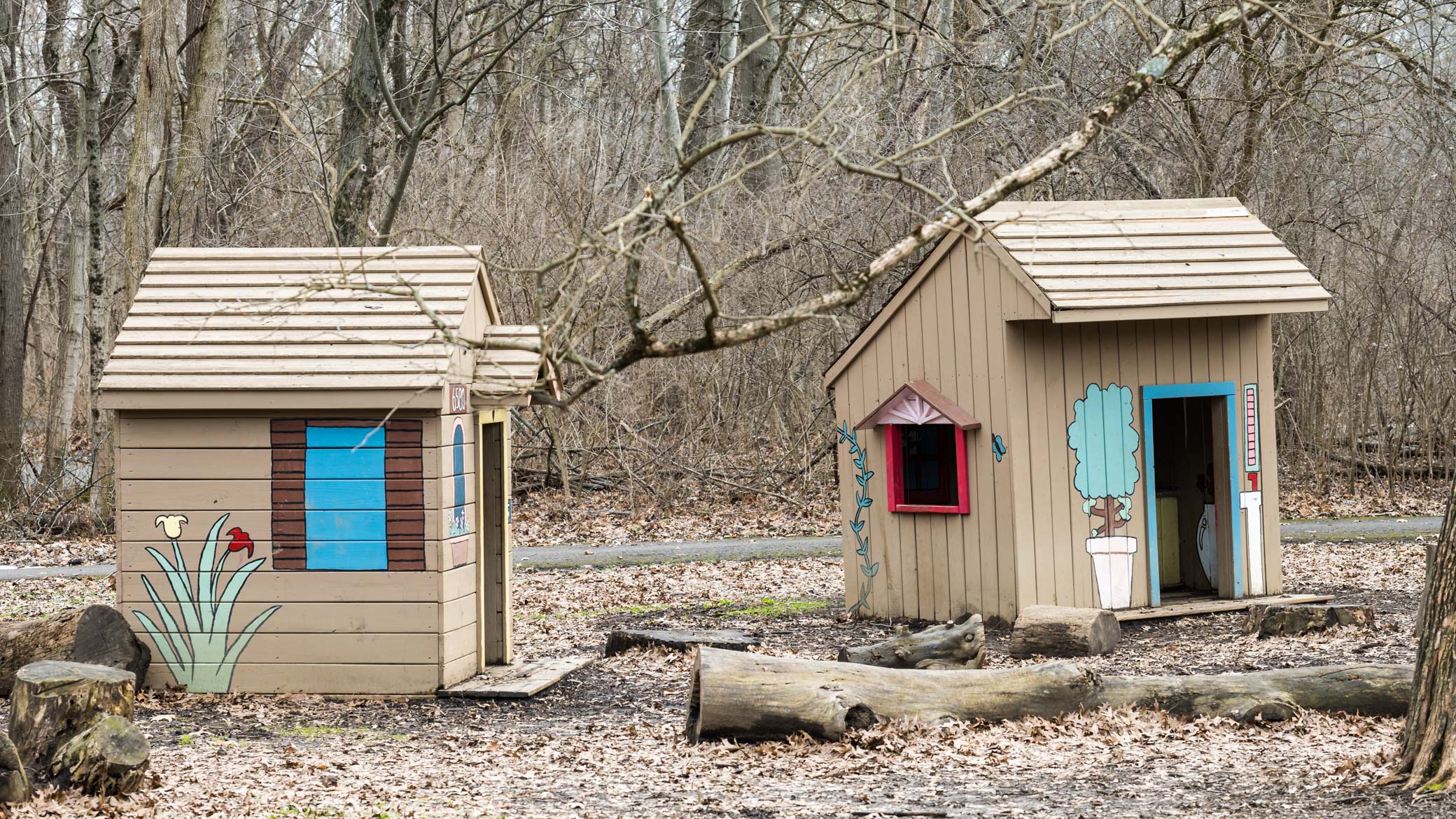 Natural play area is installed by the main parking lot. Restroom facilities are located next to a picnic area.